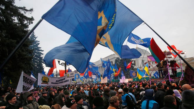 The issue that ignited the protests was President Viktor Yanukovych's shelving of an 'association agreement' with the EU and a turn toward closer ties with Russia. Moscow has put heavy pressure on Ukraine to join a Russia-led customs union. Yanukovych and Russian President Vladimir Putin are to meet on Tuesday, and speculation is strong that Yanukovych will give into Russian financial incentives and sign on, a move that opposition leaders warn would only make the protests grow.