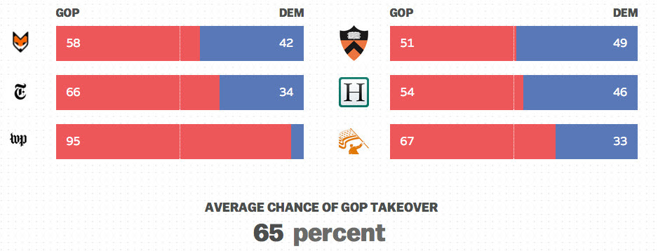 Five of the models we're tracking at our forecast hub now give the GOP a narrow edge to retake the chamber, of between 51 percent and 67 percent. Though Nate Silver of FiveThirtyEight and Sam Wang of the Princeton Election Consortium have been publicly feuding over methodology lately, as of Friday morning their actual estimates were only 7 points apart. Wang's estimate, which previously gave a sizable advantage to Democrats, has now moved much closer to where Silver has been all along.